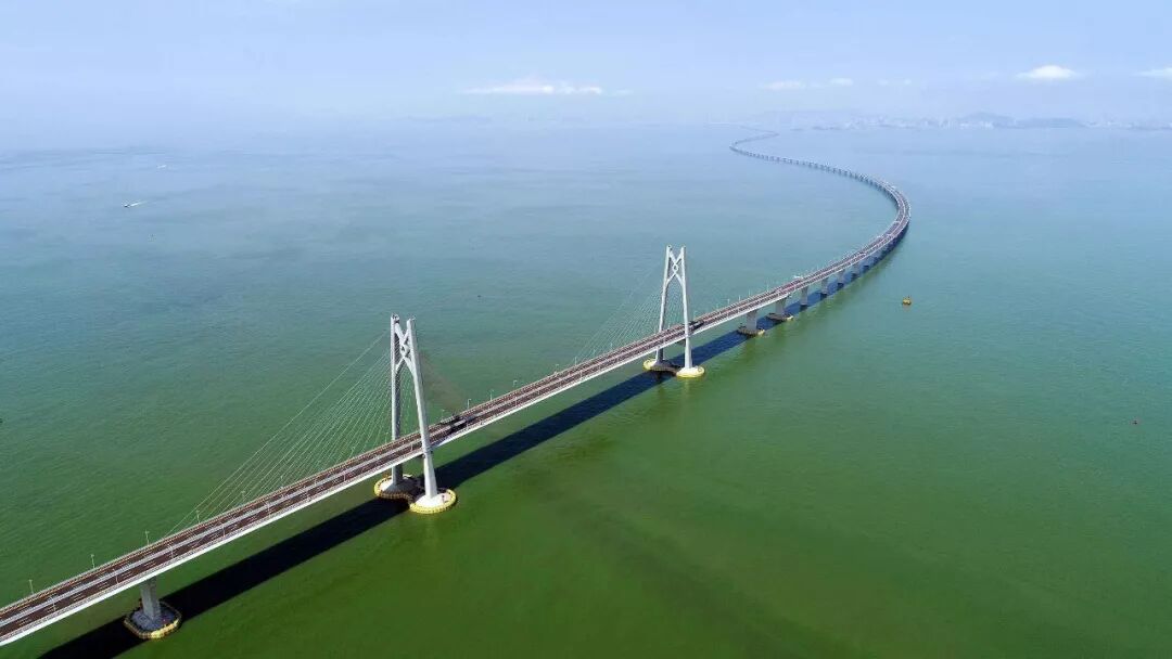 港珠澳大桥是世界最长的跨海大桥,被英国《卫报》评为“新世界七大奇迹”之一,线路全长55公里、使用寿命120年、可抗台风16级、主梁钢板42万吨、桥墩224个。