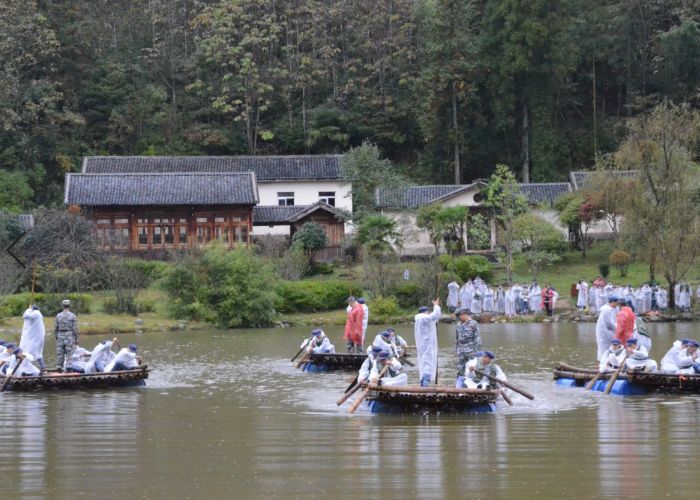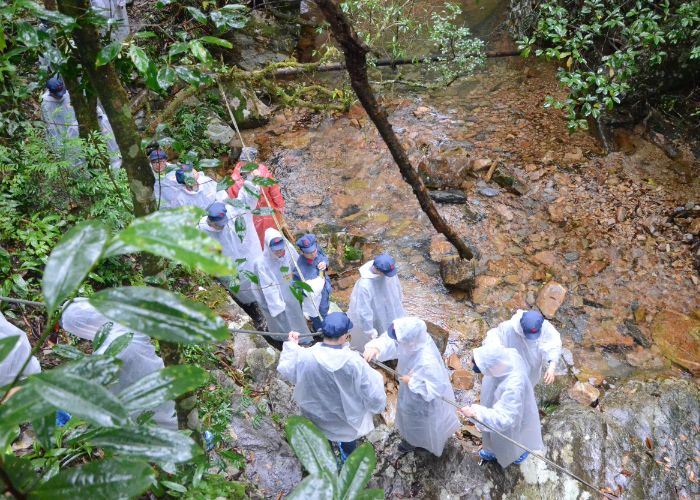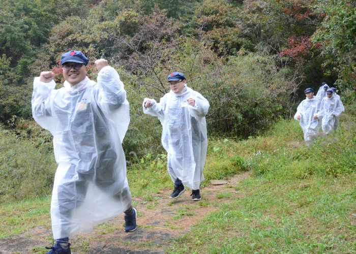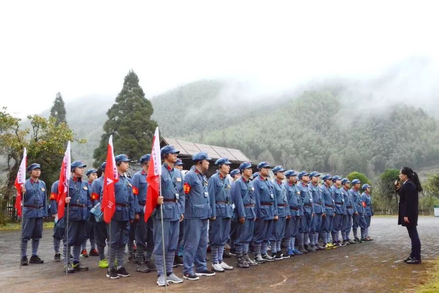 在近四个小时的时间里,他们进入蜿蜒茂密的小径、跨过湍急的溪流、攀登陡峭的石崖、迈上满是青苔的竹桥,高喊团名、齐唱团歌,带着建华人的坚毅与果敢,乐观积极的态度,相互鼓励、互相协作,不顾风雨,一路向前,亲身感受革命先辈们那一段艰苦的长征路。