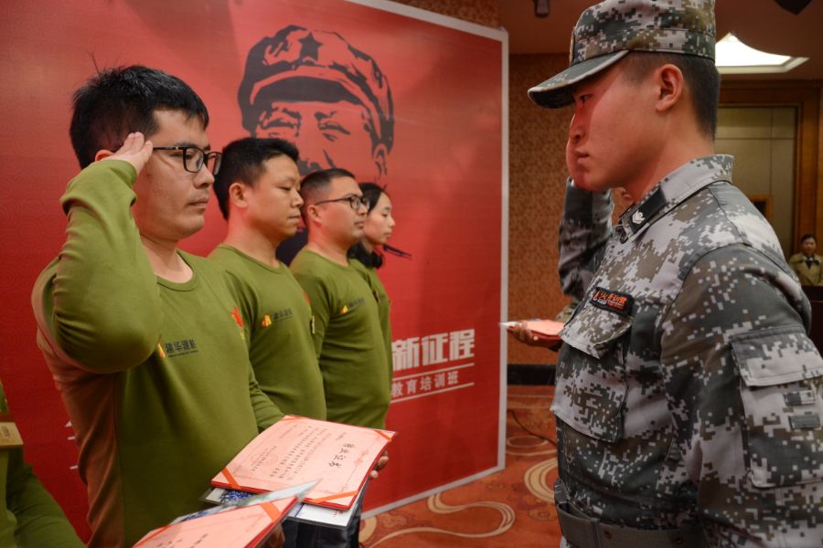 开营仪式上,心灵的触动激发了学员们行动上的积极,军事训练环节里,划分的红四、红五两军八团,个个精神抖擞,斗志昂扬,接过代表集体荣誉的团旗,接受检阅,立正、转身、齐步、敬礼,一系列的动作铿锵有力、利落非常,各团相互较劲,一声高过一声,谁也不甘落后,体现了建华人敢拼敢赢、永争第一的良好品质,也将令行禁止、执行到位的原则呈现的淋漓尽致。