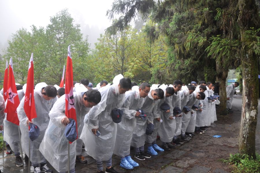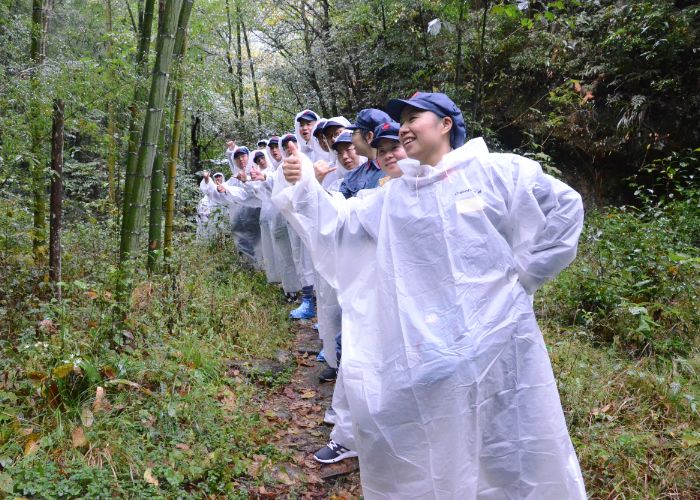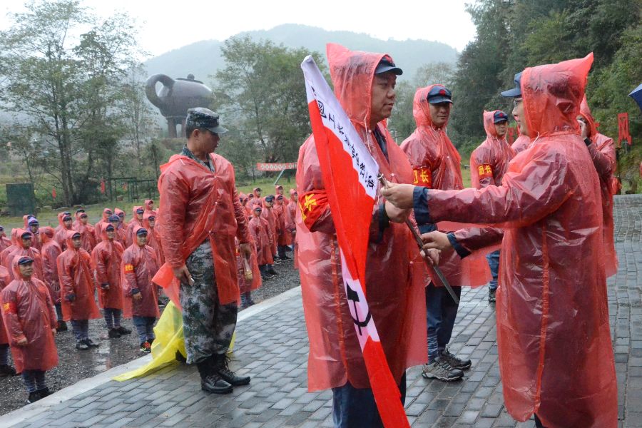 15日上午,天空飘着细雨,青年精英队的学员们来到领秀峰进行徒步拓展,挑战穿越丛林,重走红军路。