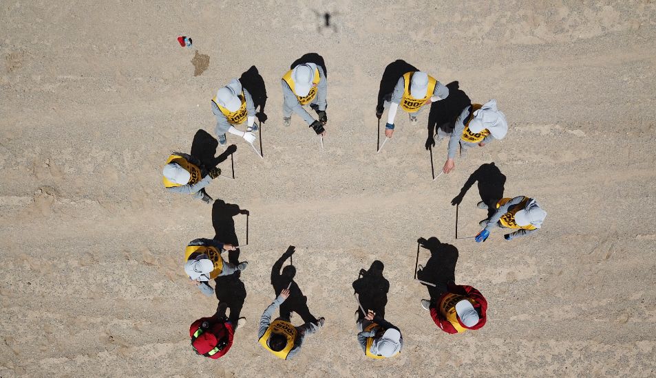 盼望着、期待着、颠簸着,第二天上午,百人团终于抵达了远征起始地——古丝绸之路戈壁起点,揉腿、甩腕,活动筋骨,舒展身体,为接下来的征途作准备。