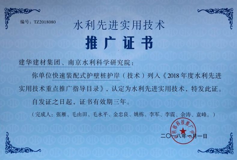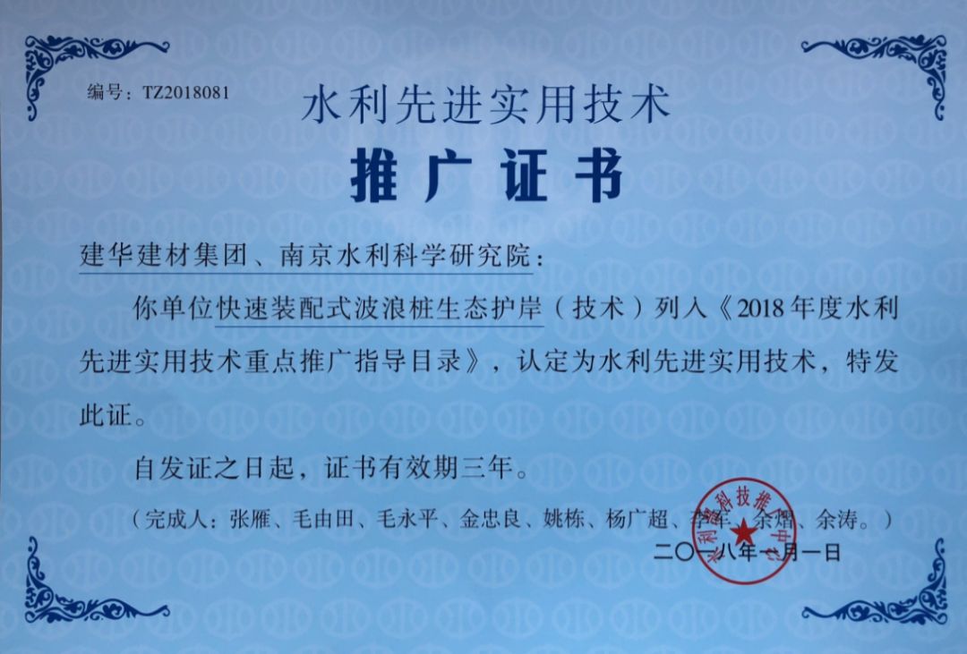 近日,水利部科技推广中心颁布《2018年度水利先进实用技术重点推广指导目录》,买足球的软件app推荐集团(以下简称买足球的软件app推荐)“快速装配式波浪桩生态护岸”、“快速装配式护壁桩护岸”两款产品成功入选,并被授予“水利先进实用技术”推广证书认可。