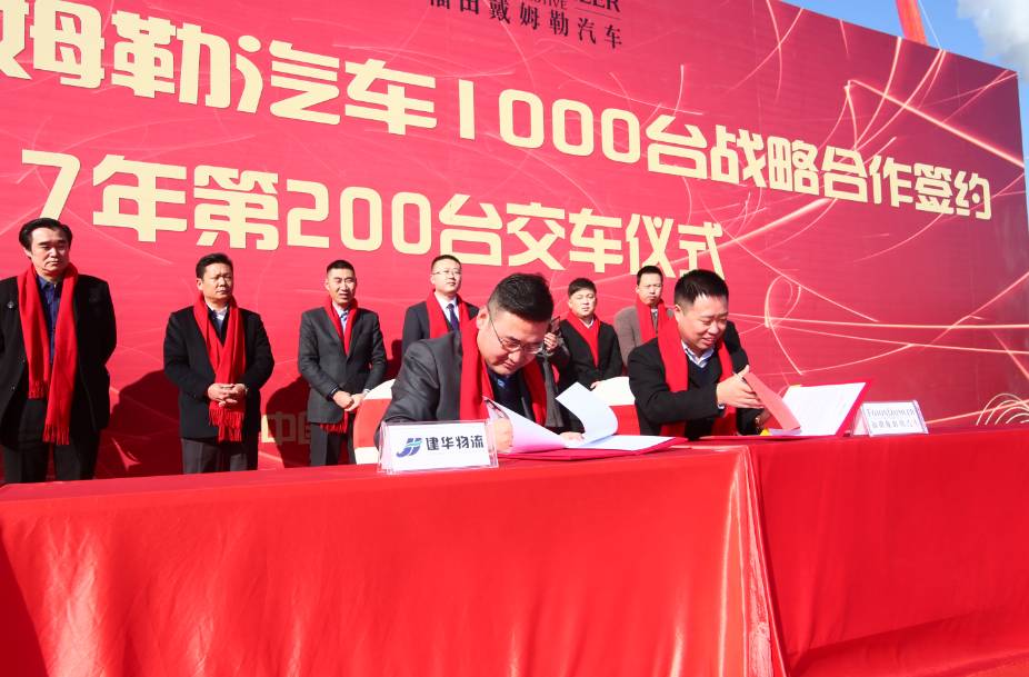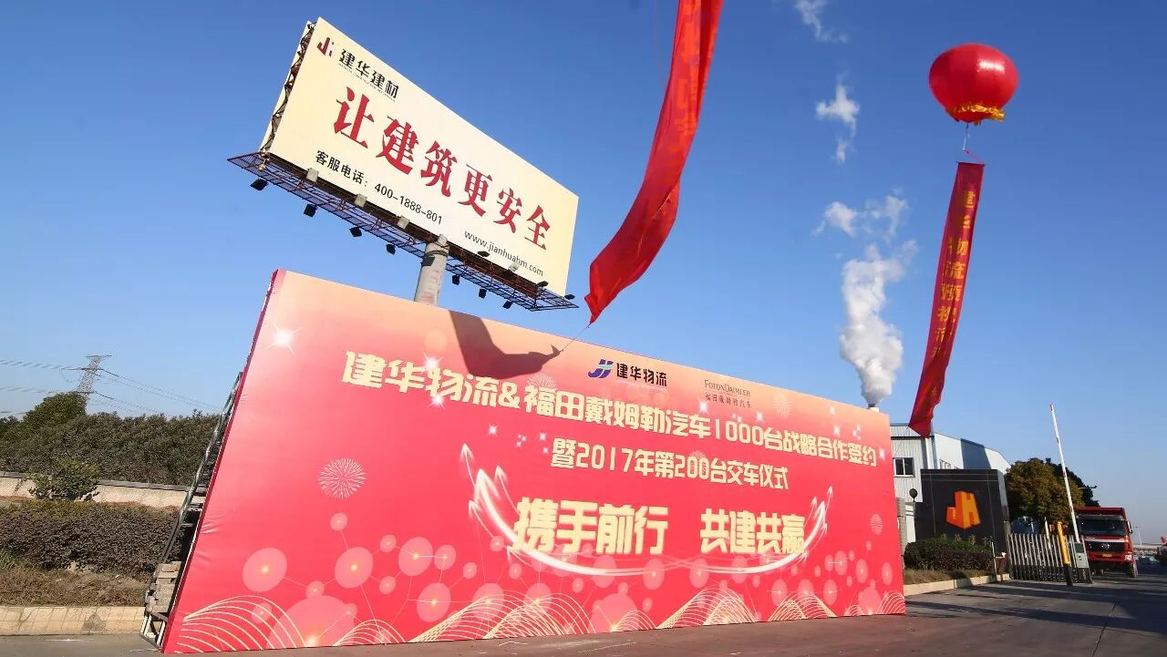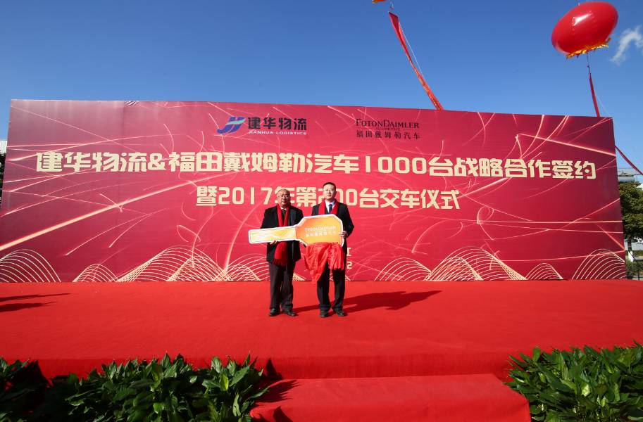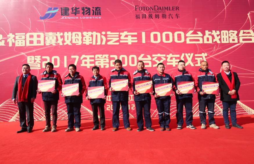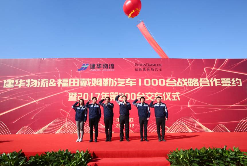 12月8日,建华物流&福田戴姆勒汽车1000台战略合作签约暨2017年第200台交接仪式在江苏镇江隆重举行。建华物流总裁马通瑞、北京福田戴姆勒汽车营销公司副总经理兼华东分公司总经理杨志江、镇江市道路运输协会货运分会会长谈建祥等领导,以及来自镇江和周边地区30余家物流企业嘉宾应邀出席,共同见证了本次活动。