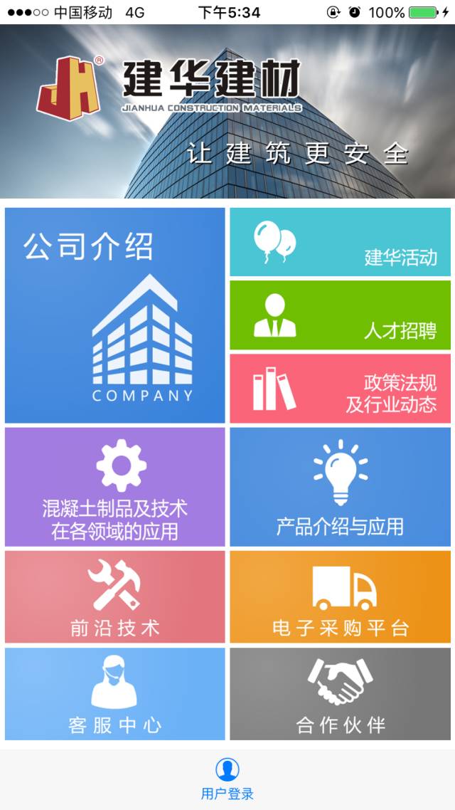 建华建材APP是一款开放式的专业应用APP,以全国客户单位、行业伙伴为目标用户。用户通过扫描指定二维码下载安装并登录APP后(安装方式见后),即可在首页查看到公司介绍、建华活动、人才招聘、政策法规、行业动态、混凝土制品及技术在各领域的应用、 产品介绍和应用、前沿技术、客服中心、电子采购平台、合作伙伴等多个信息模块,帮助用户快速了解企业信息以及企业最新产品技术。