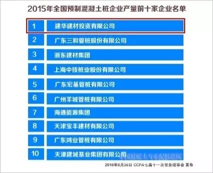 在2016年6月26日召开的中国混凝土与水泥制品协会七届十一次常务理事会上,协会发布了2015年全国预制混凝土桩产量前十家企业排名情况。