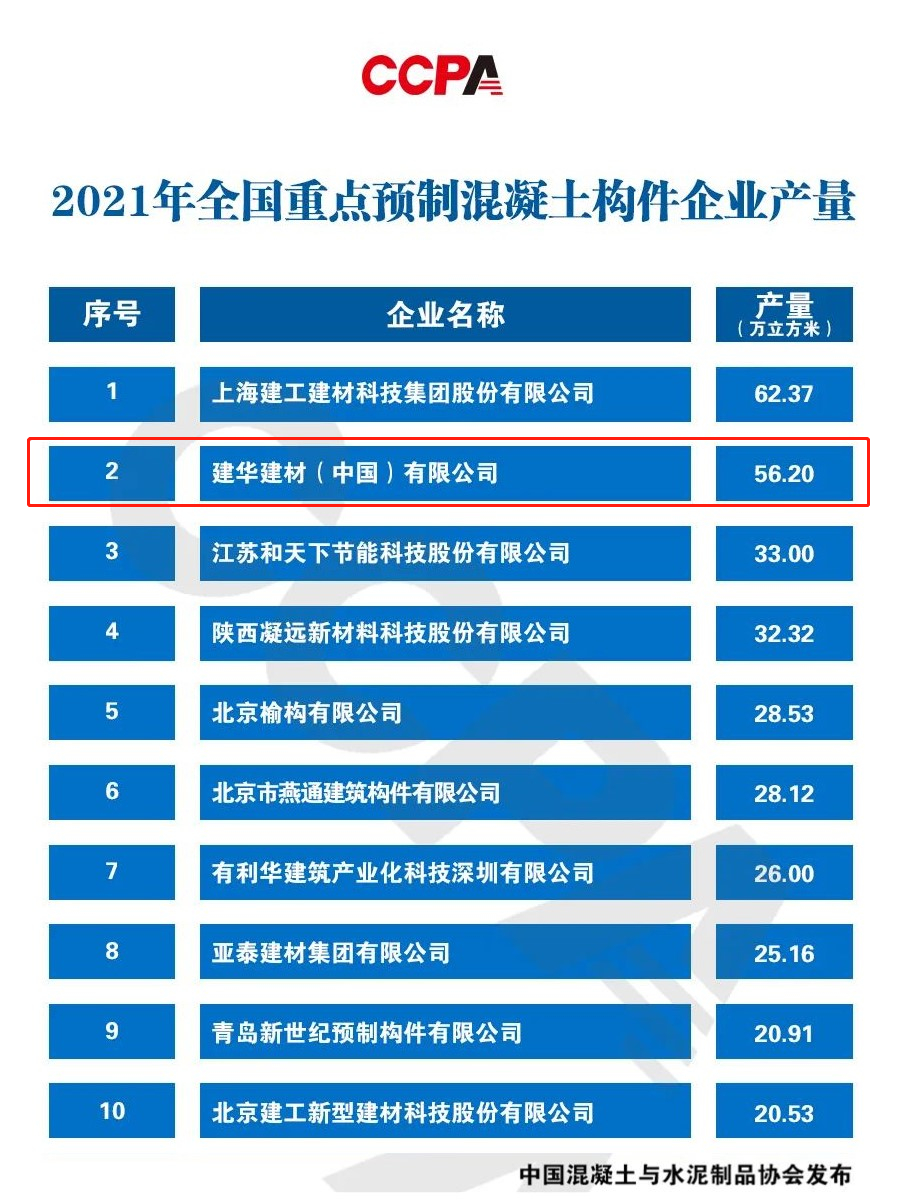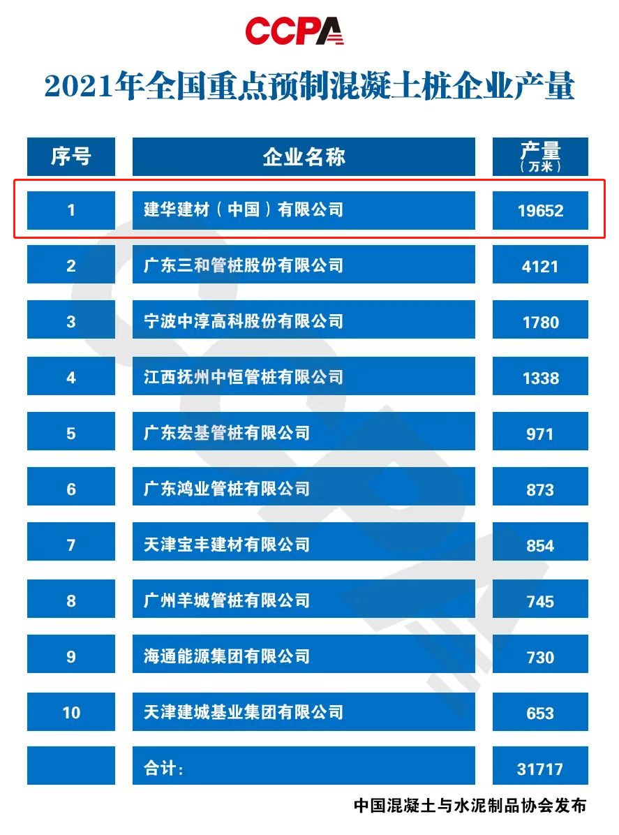近日,中国混凝土与水泥制品协会发布了2021年度全国重点混凝土与水泥制品企业的产量排名。买足球的软件app推荐以1.9652亿米的年产量蝉联预制混凝土桩榜单第一名,以56.2万立方米的年产量位列预制混凝土构件榜单第二名。