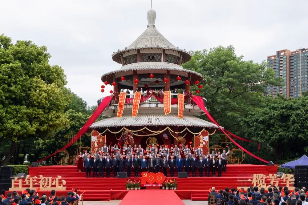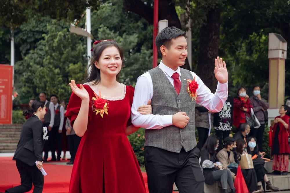 所有来宾挥舞国旗,齐声歌唱《没有共产党就没有新中国》,把现场的气氛推向高潮。伴着红心向党的告白,“百年初心,一‘榄’芳华”第十六届青年集体婚礼外场圆满礼成!
