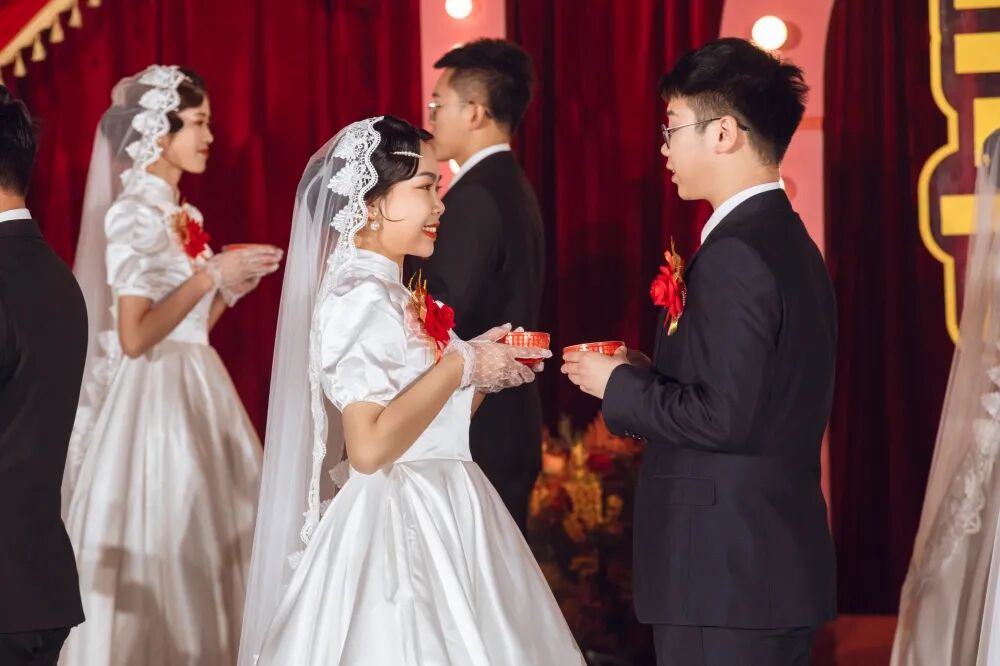 音乐缓缓响起,灯光渐渐聚焦。在优美的旋律中,22对新人踏着节拍,伴着轻盈的舞步共同入场。在添喜环节,新人们共饮甜茶,感受其中甜蜜、滋润的幸福。随后,新人们四目相对举行浪漫拥吻礼,在现场领导、嘉宾的见证下举行神圣的婚礼仪式。
