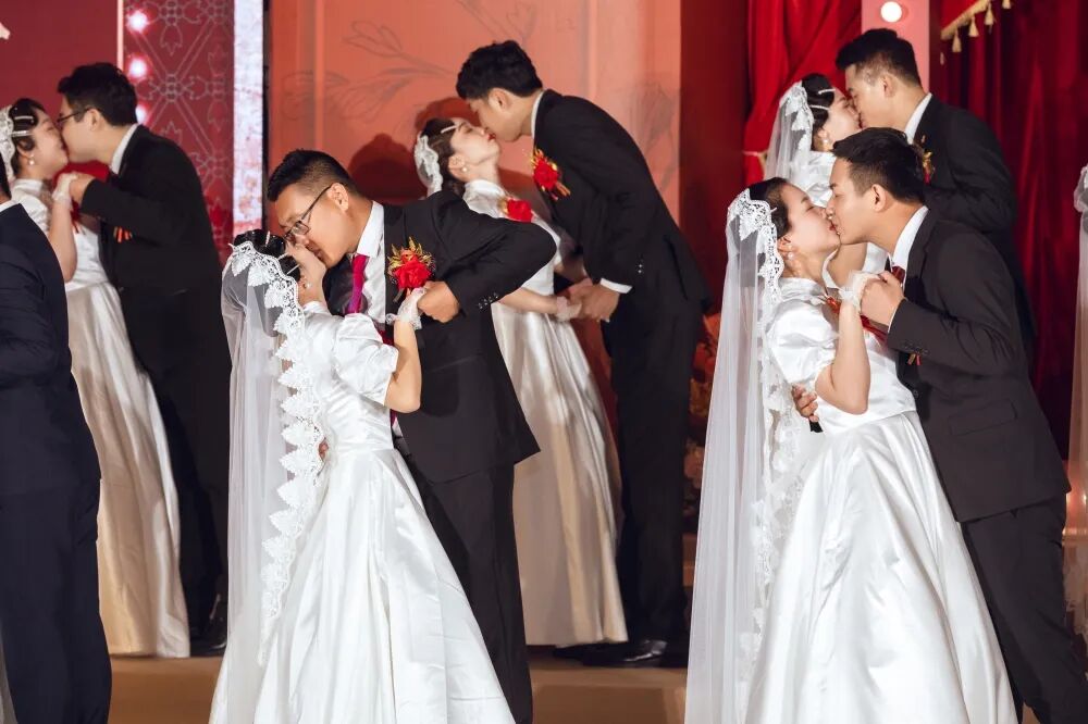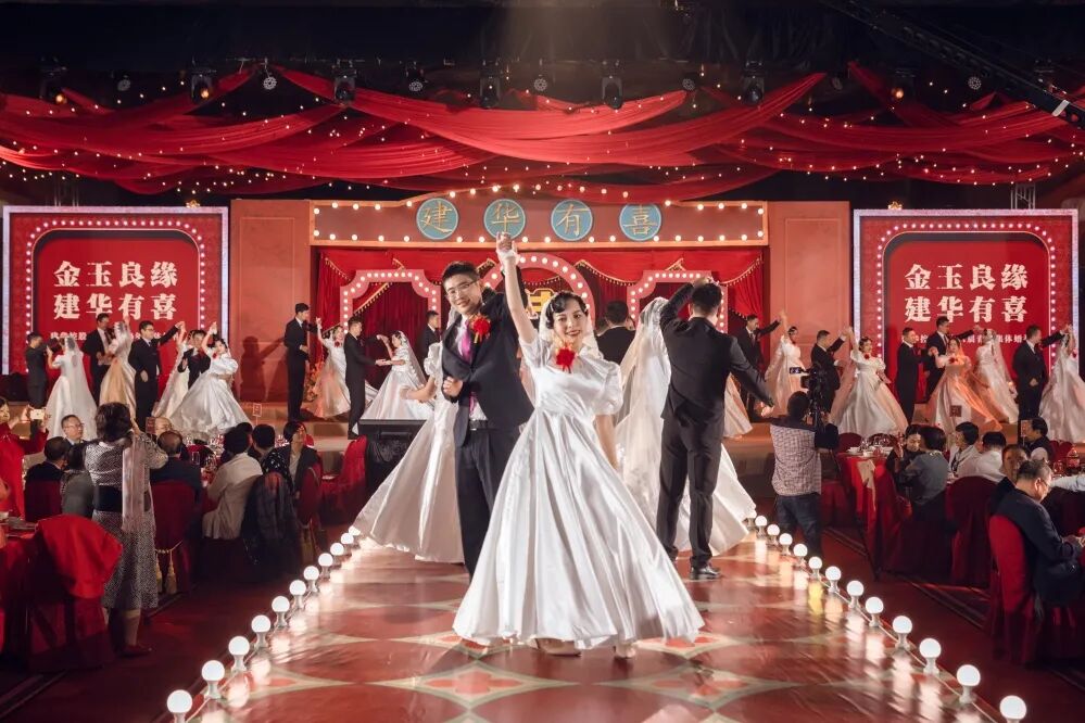 22对新人在鼓舞飞扬的开场舞中步入婚礼殿堂,幸福喜悦在每个人脸上洋溢。