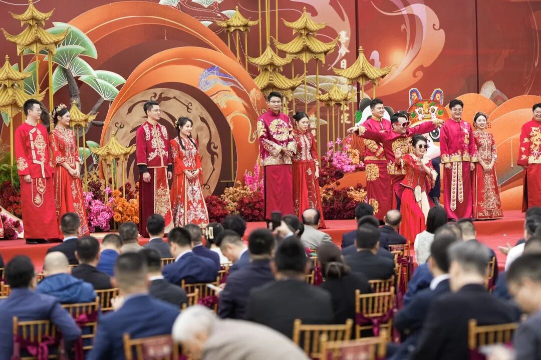 创始人许景新先生为新人们证婚,对全体新人喜结良缘表示祝贺,希望全体新人们以孝心和耐心对待父母、以爱和包容对待子女、以尊重和理解对待爱人,一言一行都要对婚姻负责、对家庭负责。互敬互谅,方能家庭和睦、事业长青。并为他们送上了代表金玉良缘的纯金龙凤牌,寓意他们婚后生活举案齐眉、情比金坚。